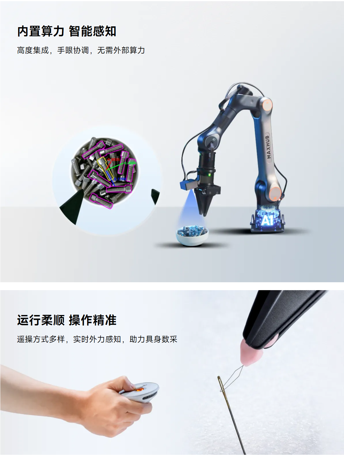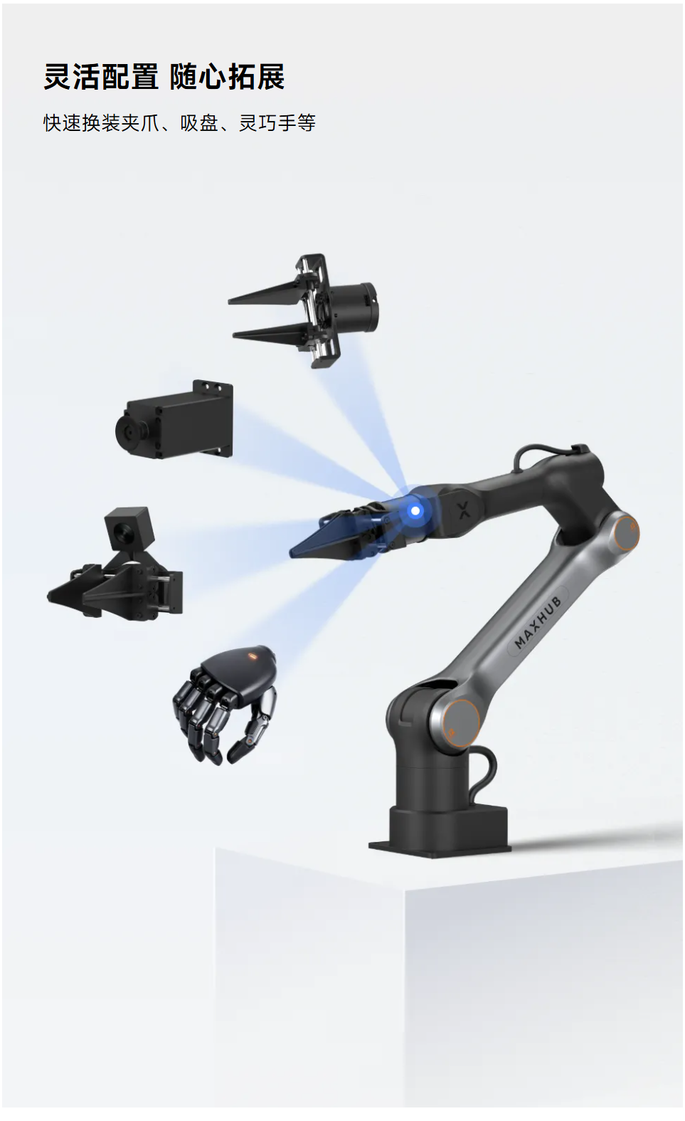 精准与柔性兼具,快速换装夹爪、吸盘、灵巧手,适用于科研教育、数采中心、制造业柔性⽣产、商业自动化、智慧农业等